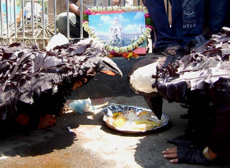 TRS activists masquerading as crows pick at food cooked as part of the ‘Shradh’ rituals on the 40th day of the boycotting of the state Assembly, at Lal Darwaza Crossroads in Hyderabad on Wednesday. The TPJAC had earlier announced that it would observe the ‘last rites’ of the Assembly for the failure of the government to introduce a resolution in favour of Telangana. The Shradh rituals were organised by the TRS and the Old City JAC. INN Photos