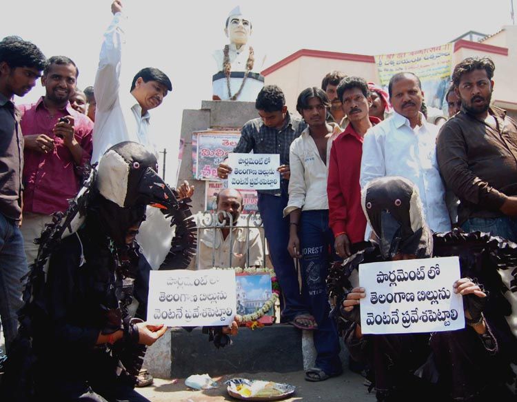 TRS activists masquerading as crows pick at food cooked as part of the ‘Shradh’ rituals on the 40th day of the boycotting of the state Assembly, at Lal Darwaza Crossroads in Hyderabad on Wednesday. The TPJAC had earlier announced that it would observe the ‘last rites’ of the Assembly for the failure of the government to introduce a resolution in favour of Telangana. The Shradh rituals were organised by the TRS and the Old City JAC. INN Photos