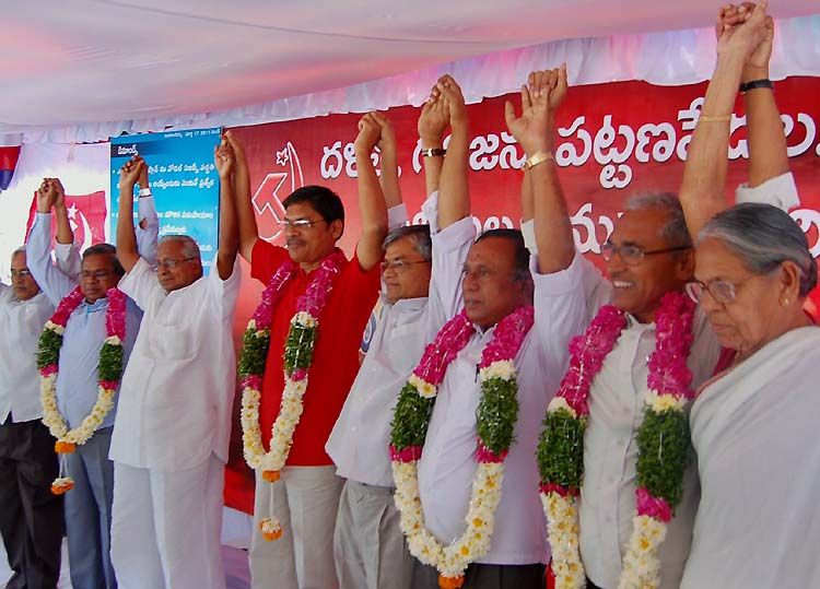 Veteran Communist leader Mallu Swarajyam garlands Communist Party of India (Marxist) state secretary BV Raghavulu as he begins his indefinite hunger fast at Indira Park in Hyderabad on Thursday. INN Photos