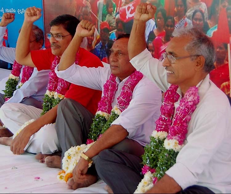 Veteran Communist leader Mallu Swarajyam garlands Communist Party of India (Marxist) state secretary BV Raghavulu as he begins his indefinite hunger fast at Indira Park in Hyderabad on Thursday. INN Photos
