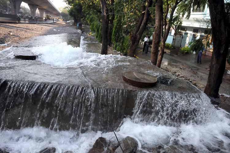 Main Roads and residential colonies were inundated with gushing water as Krishna water pipeline burst at Lakshmi Nagar near ring road in Hyderabad on Friday. -INN Photos
