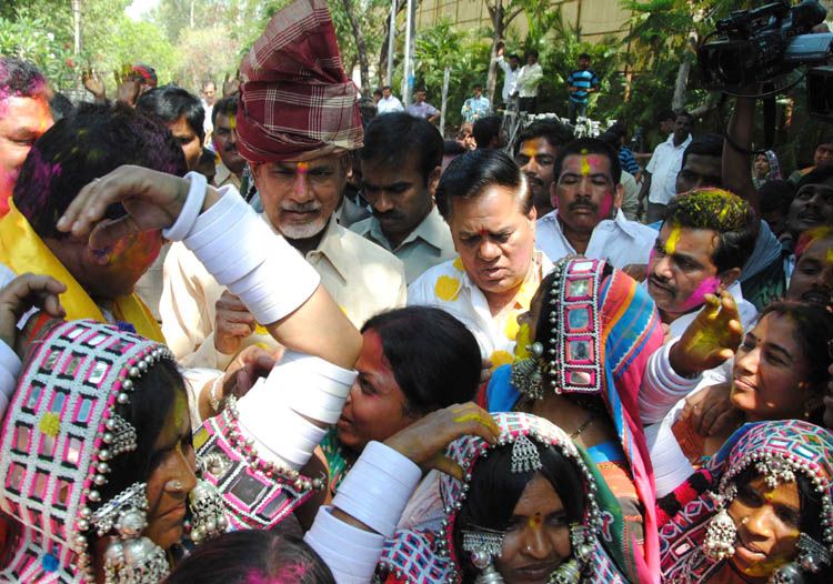 Telugu Desam Party president N Chandrababu Naidu dances with women of the Lambada community at his residence in Hyderabad as part of the Holi celebrations. INN Photos