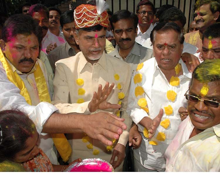 Telugu Desam Party president N Chandrababu Naidu dances with women of the Lambada community at his residence in Hyderabad as part of the Holi celebrations. INN Photos