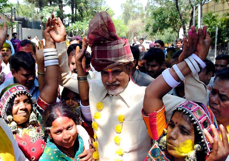 Telugu Desam Party president N Chandrababu Naidu dances with women of the Lambada community at his residence in Hyderabad as part of the Holi celebrations. INN Photos