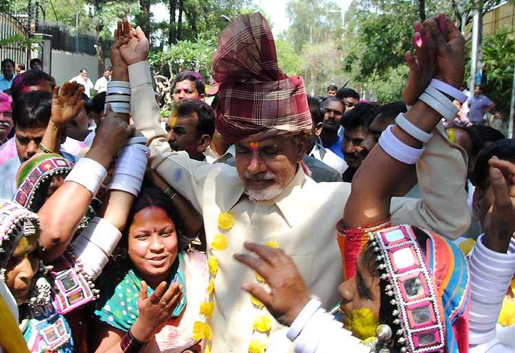 Telugu Desam Party president N Chandrababu Naidu dances with women of the Lambada community at his residence in Hyderabad as part of the Holi celebrations. INN Photos