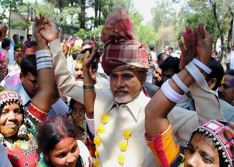 Telugu Desam Party president N Chandrababu Naidu dances with women of the Lambada community at his residence in Hyderabad as part of the Holi celebrations. INN Photos