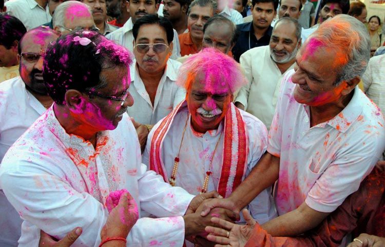BJP leader and former union minister Bandaru Dattatreya flanked by City Police Commissioner AK Khan and CPI State secretary K Narayana at the Holi celebrations organized by Public Gardens’ Walkers Association at Public Gardens in Hyderabad on Saturday. INN Photos