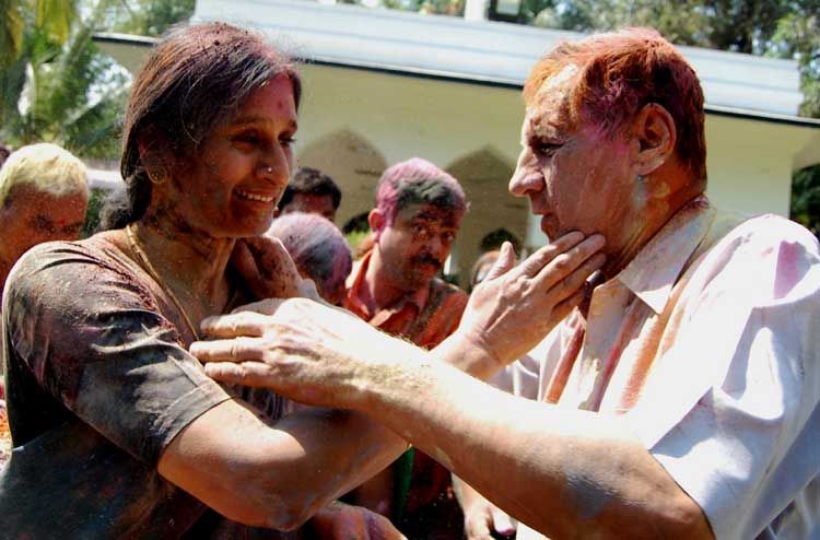 Governor ESL Narasimhan breaks into improptu jig with Mrs Vimala Narasimhan after smearing colors along with other guests during the Holi celebrations at Raj Bhavan in Hyderabad on Saturday. INN Photos
