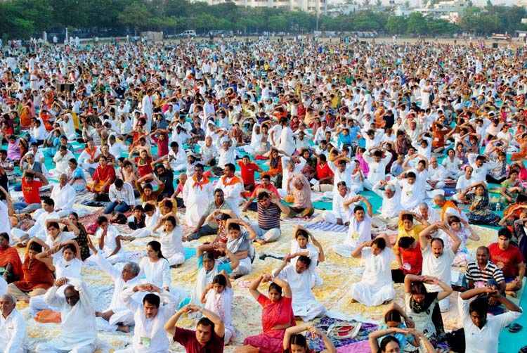Baba Ramdev demonstrates a few yogic exercise to his followers at the Yoga Camp at NTR Stadium in Hyderabad on Sunday. INN Photos