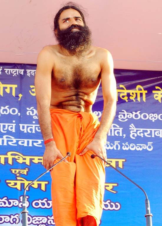 Baba Ramdev demonstrates a few yogic exercise to his followers at the Yoga Camp at NTR Stadium in Hyderabad on Sunday. INN Photos