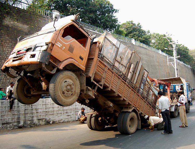 Traffic thrown out of gear at the busy Lower Tank Bund thoroughfare when an overloaded DCM van loaded with scrap, pushed into lower tail-end here on Tuesday.