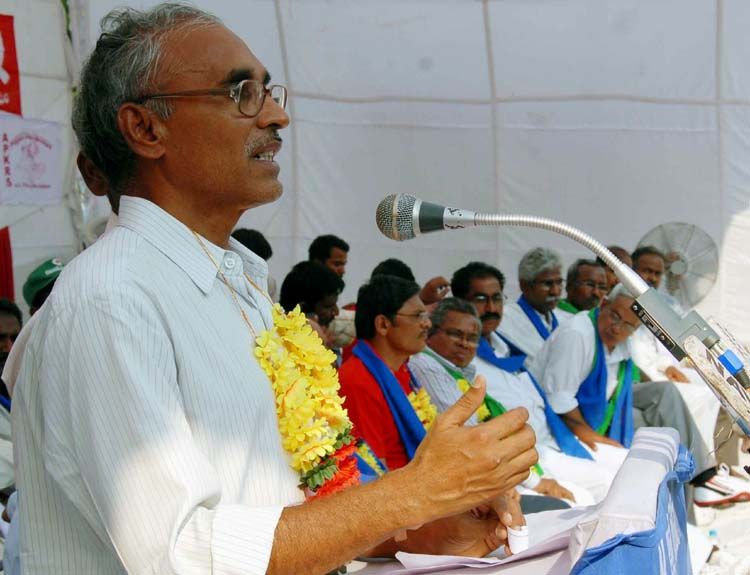CPM state secretary addressing party cadre on the eve of ending his indefinite fast today at Dharna Chowk, Indira Park in Hyderabad.-INN Photos