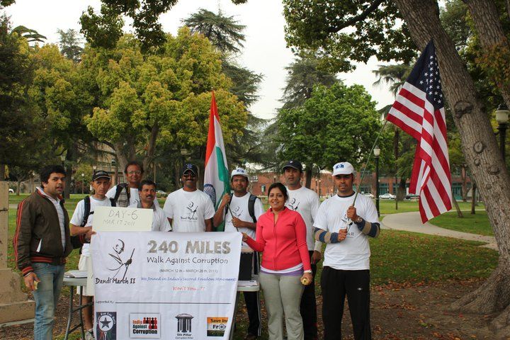 A group of NRIs who are fighting against corruption in India took up Dandi March - 2. Mahatma Gandhi marched 240 miles to Dandi to unshackle India from the clutches of British. Modern India is in the clutches of corruption. NRIs in California are emulating the great man in their actions to fight against corruption and to enact Jan Lokpal bill. They are marching 240 miles along the American west coast, to re-invoke the great values Gandhi believed in.