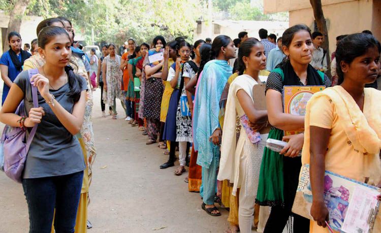 Students queue up at the entrances of one of the examination centres as the SSC exams begin in Hyderabad on Thursday. INN Photos