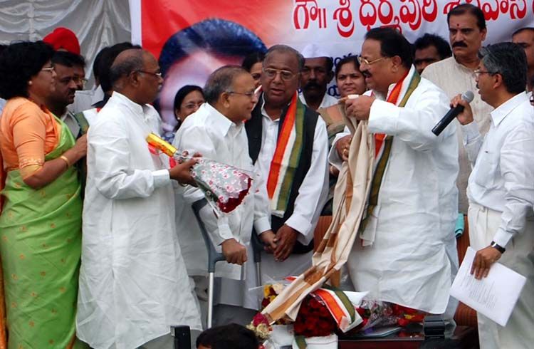 Chief Minister N Kiran Kumar Reddy greets APCC president D Srinivas on his successful completion of three years as the state party chief at a function at Gandhi Bhavan in Hyderabad on Sunday. Former chief minister K Rosaiah Union Minister Jaipal Reddy and other leaders are also seen. INN Photos