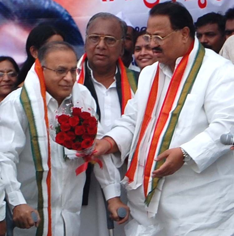 Chief Minister N Kiran Kumar Reddy greets APCC president D Srinivas on his successful completion of three years as the state party chief at a function at Gandhi Bhavan in Hyderabad on Sunday. Former chief minister K Rosaiah Union Minister Jaipal Reddy and other leaders are also seen. INN Photos