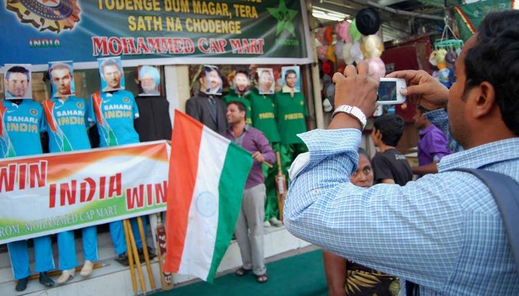 A clothes store owner utilises the world cup fever to display the Team India clothes in Hyderabad on Tuesday. INN Photos