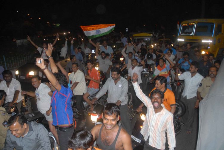 Hyderabad city erupts in joy. Scenes of dancing and singing and bursting of firecrackers witnessed all over the city. As the last wicket fell, fans burst firecrackers and came out on the roads dancing and singing. The policemen, who were out on the roads in good numbers, did not seem to mind the celebrations. Boisterous rallies were taken out on important thoroughfares such as Tank Bund, Necklace Road, Punjagutta-Begumpet main road, KBR Park main road, Musheerabad, Dilsukhnagar, Banjara Hills, and Jubilee Hills.