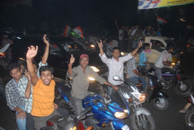 Hyderabad city erupts in joy. Scenes of dancing and singing and bursting of firecrackers witnessed all over the city. As the last wicket fell, fans burst firecrackers and came out on the roads dancing and singing. The policemen, who were out on the roads in good numbers, did not seem to mind the celebrations. Boisterous rallies were taken out on important thoroughfares such as Tank Bund, Necklace Road, Punjagutta-Begumpet main road, KBR Park main road, Musheerabad, Dilsukhnagar, Banjara Hills, and Jubilee Hills.