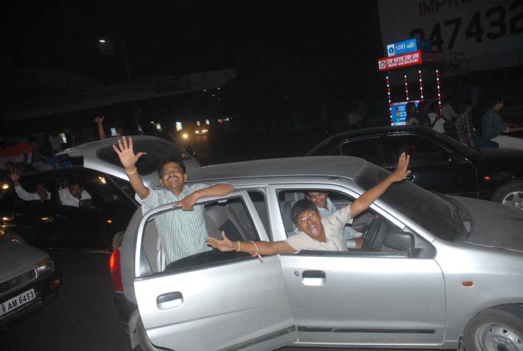 Hyderabad city erupts in joy. Scenes of dancing and singing and bursting of firecrackers witnessed all over the city. As the last wicket fell, fans burst firecrackers and came out on the roads dancing and singing. The policemen, who were out on the roads in good numbers, did not seem to mind the celebrations. Boisterous rallies were taken out on important thoroughfares such as Tank Bund, Necklace Road, Punjagutta-Begumpet main road, KBR Park main road, Musheerabad, Dilsukhnagar, Banjara Hills, and Jubilee Hills.