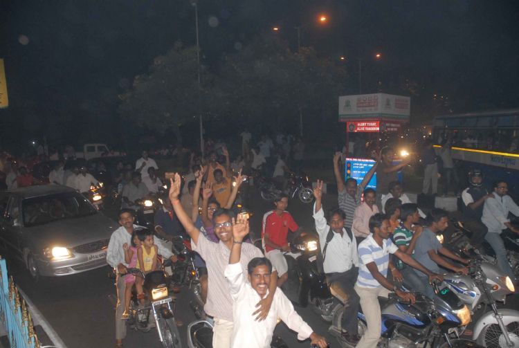 Hyderabad city erupts in joy. Scenes of dancing and singing and bursting of firecrackers witnessed all over the city. As the last wicket fell, fans burst firecrackers and came out on the roads dancing and singing. The policemen, who were out on the roads in good numbers, did not seem to mind the celebrations. Boisterous rallies were taken out on important thoroughfares such as Tank Bund, Necklace Road, Punjagutta-Begumpet main road, KBR Park main road, Musheerabad, Dilsukhnagar, Banjara Hills, and Jubilee Hills.