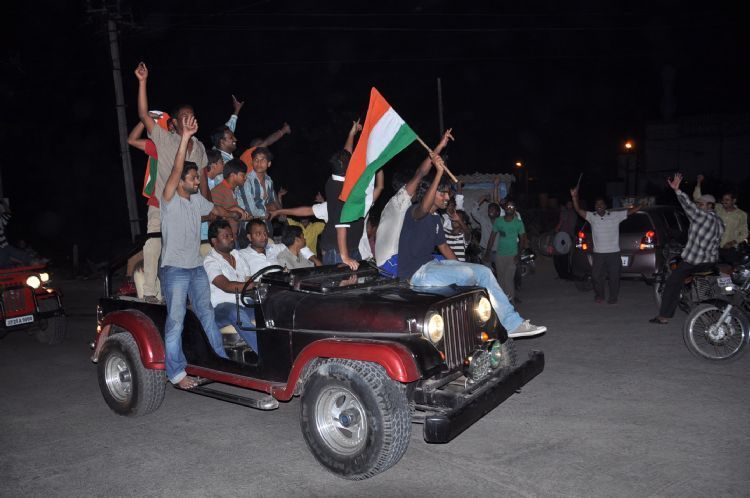 Hyderabad city erupts in joy. Scenes of dancing and singing and bursting of firecrackers witnessed all over the city. As the last wicket fell, fans burst firecrackers and came out on the roads dancing and singing. The policemen, who were out on the roads in good numbers, did not seem to mind the celebrations. Boisterous rallies were taken out on important thoroughfares such as Tank Bund, Necklace Road, Punjagutta-Begumpet main road, KBR Park main road, Musheerabad, Dilsukhnagar, Banjara Hills, and Jubilee Hills.