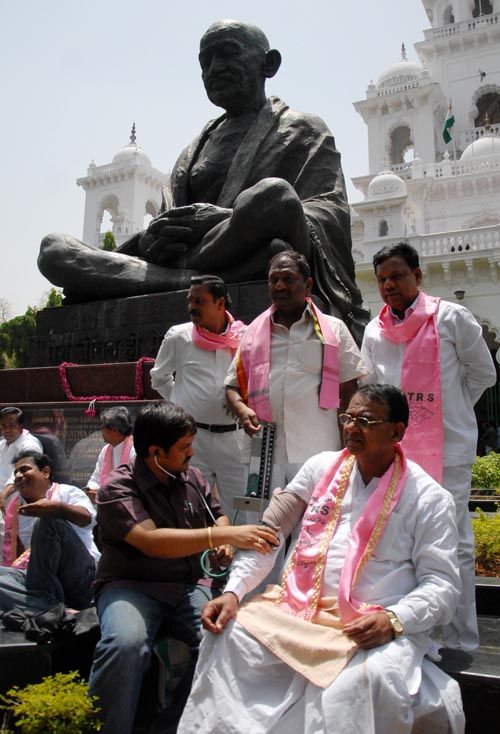 Telugu Desam Party MLA Pocharam Srinivas, along with TRS MLAs stages a sit-in protest at the Gandhi statue on Assembly premises in Hyderabad on Friday. Mr Srinivas later withdrew his protest after being assured by Deputy Speaker Nadendla Manohar that a decision on his resignation would be taken within two days. INN Photo