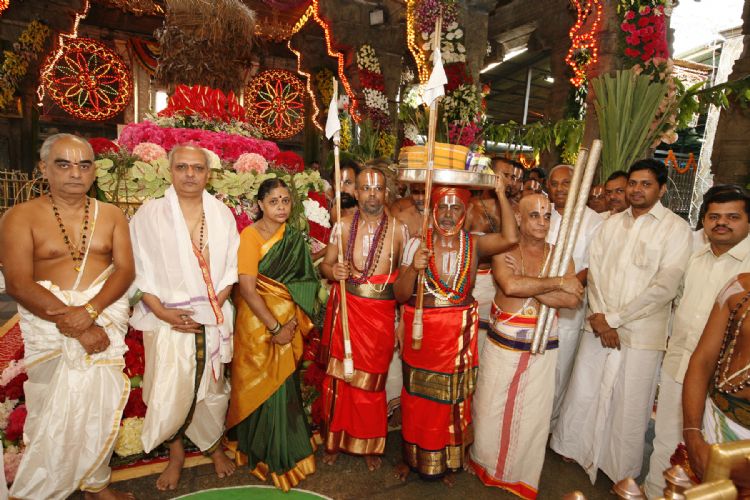 Special rituals like - visesha padi procession and visesha nuthana vastrams procession was performed inside the Vimana prakaram of the temple complex followed by the auspicious `Panchanga Sravanam' to the processional deities of Lord Malayapa and his consorts atop Sarvabhoopala Vahanam in Bangaru vakili, in front of the presiding deity, by the temple priests.