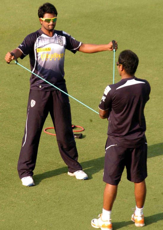 Members of the Deccan Chargers train at the Rajiv Gandhi International Stadium at Uppal in Hyderabad on Tuesday. They earlier posed for lensmen at a promotional event. INN Photos