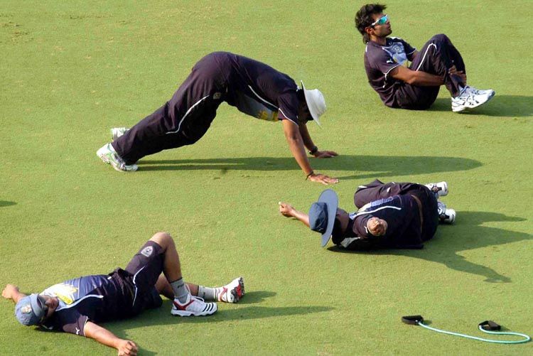 Members of the Deccan Chargers train at the Rajiv Gandhi International Stadium at Uppal in Hyderabad on Tuesday. They earlier posed for lensmen at a promotional event. INN Photos
