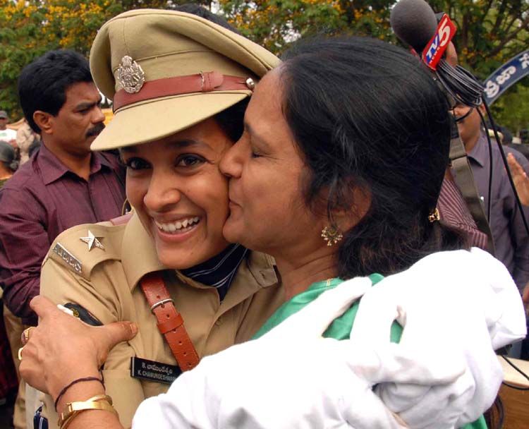 Emotional moments: A woman police officer share moments of happiness with her mother after passing out parade of the eighth batch of Deputy Superintendents of Police at the APPA at Himayathsagar, in Hyderabad on Friday. INN Photos