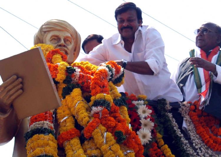 Praja Rajyam president Chiranjeevi garlanding Mahathma Jyotho Rao Pules statue on the eve of his 185th jayanti celebrations at Amberpet in Hyderabad on Monday.