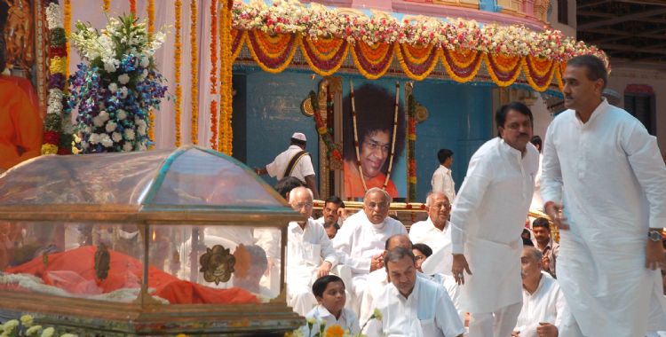 Devotees including State, Central ministers, Politicians, Celebrities paying their last respect to the body of Sri Sathya Sai Baba at the Ashram in Puttaparthi on Monday.