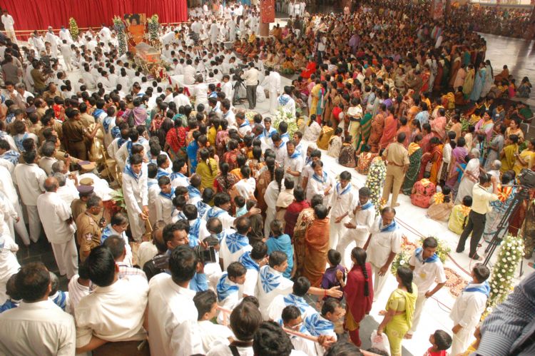 Prime Minister Manmohan Singh and Congress chief Sonia Gandhi on Tuesday join scores of devotess in paying their last respect to Sri Sathya Sai Baba. Sai Baba would be buried in the Sai Kulwanth Hall between 9 and 9.30 am tomorrow.