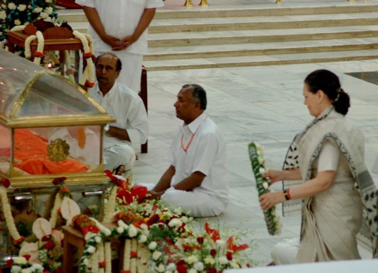 Prime Minister Manmohan Singh and Congress chief Sonia Gandhi on Tuesday join scores of devotess in paying their last respect to Sri Sathya Sai Baba. Sai Baba would be buried in the Sai Kulwanth Hall between 9 and 9.30 am tomorrow.