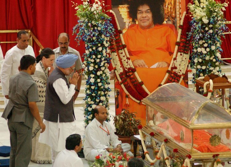 Prime Minister Manmohan Singh and Congress chief Sonia Gandhi on Tuesday join scores of devotess in paying their last respect to Sri Sathya Sai Baba. Sai Baba would be buried in the Sai Kulwanth Hall between 9 and 9.30 am tomorrow.