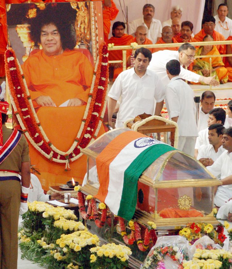 The mortal remains of the 85-year-old spiritual leader, Sathya Sai Baba, were buried at Sai Kulwant Hall in Prashanti Nilayam in Puttaparthi on Wednesday morning. The last rites were performed by his nephew R.J. Ratnakar in accordance with vedic customs following full police honours.