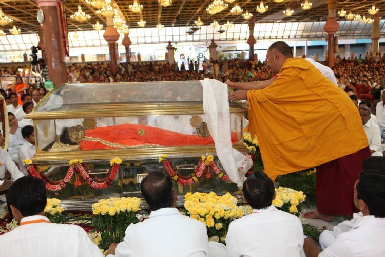 The mortal remains of Sathya Sai Baba were buried at Sai Kulwant Hall in Prashanti Nilayam in Puttaparthi on Wednesday morning. The last rites were performed by his nephew R.J. Ratnakar in accordance with vedic customs following full police honours.
