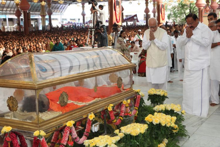 The mortal remains of Sathya Sai Baba were buried at Sai Kulwant Hall in Prashanti Nilayam in Puttaparthi on Wednesday morning. The last rites were performed by his nephew R.J. Ratnakar in accordance with vedic customs following full police honours.