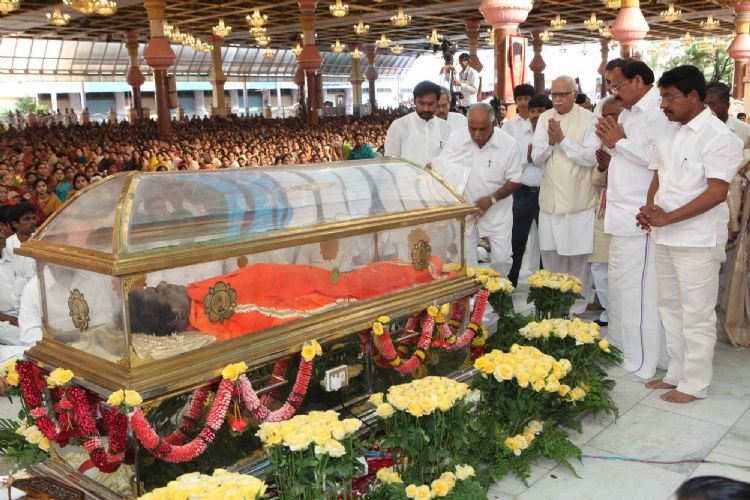 The mortal remains of Sathya Sai Baba were buried at Sai Kulwant Hall in Prashanti Nilayam in Puttaparthi on Wednesday morning. The last rites were performed by his nephew R.J. Ratnakar in accordance with vedic customs following full police honours.