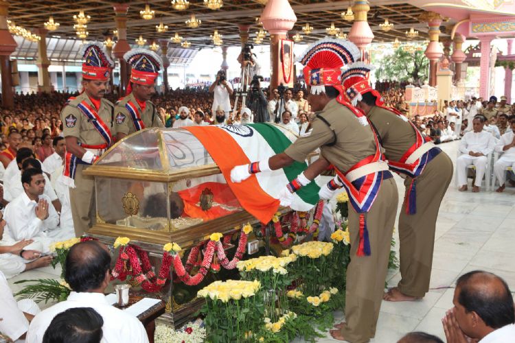 The mortal remains of Sathya Sai Baba were buried at Sai Kulwant Hall in Prashanti Nilayam in Puttaparthi on Wednesday morning. The last rites were performed by his nephew R.J. Ratnakar in accordance with vedic customs following full police honours.
