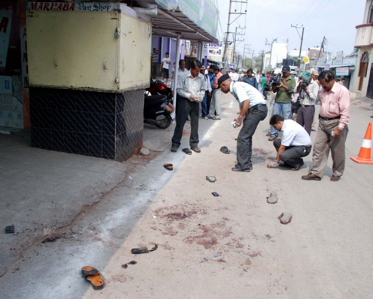CLUES team look for evidence at the scene of the attack on the life of MIM Floor Leader in the state Assembly Akbaruddin Owaisi at Chandrayngutta in Hyderabad on Saturday. INN Photos