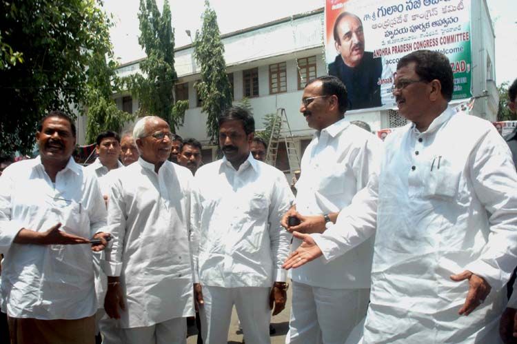 Congress MLA's at Gandhi Bhavan after meeting with Azad. Congress In-Charge for Andhra Pradesh Affairs Ghulam Nabi Azad meets party Legislators at party's state headquarters, Gandhi Bhavan in Hyderabad on Tuesday. INN Photos