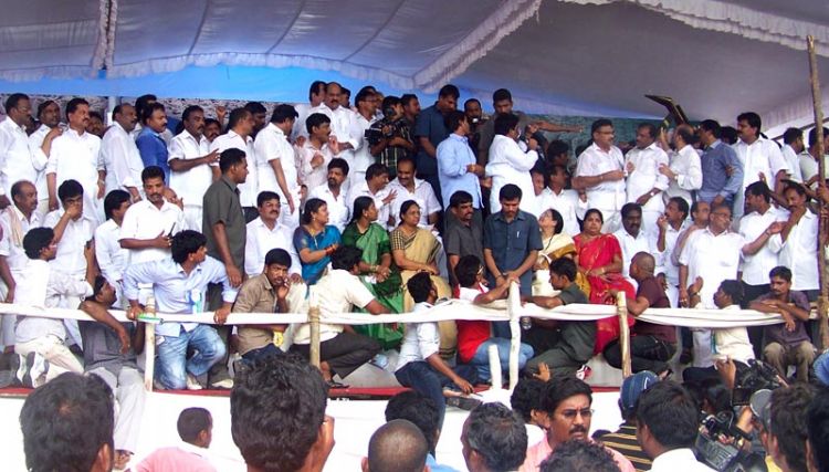YSR Congress party leaders speaking from the `Rythu Deeksha’ pranganam on the eve of ending 48 hour fast by Kadapa MP YS Jaganmohan Reddy at the YSR Rythu Pranaganam, Nallapadu on the Guntur–Hyderabad Highway on Tuesday. INN Photos