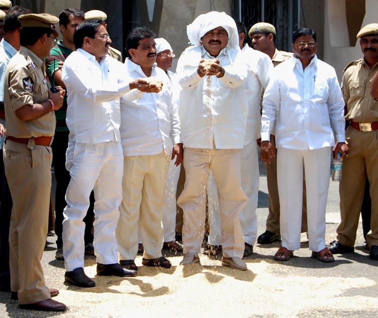Telugu Desam Party leaders protest against the government’s failure to announce remunerative prices and address the problems of farmers in front of the C Block of the state Secretariat in Hyderabad on Saturday. The TDP leaders later courted arrest and were shifted to the Saifabad police station. INN Photos
