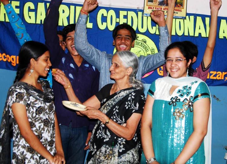 Families of Puja Dolui who secured 564 marks and Himanshi Agarwal who secured 541 marks in the SSC public examinations offer them sweets in Hyderabad on Saturday. INN Photos