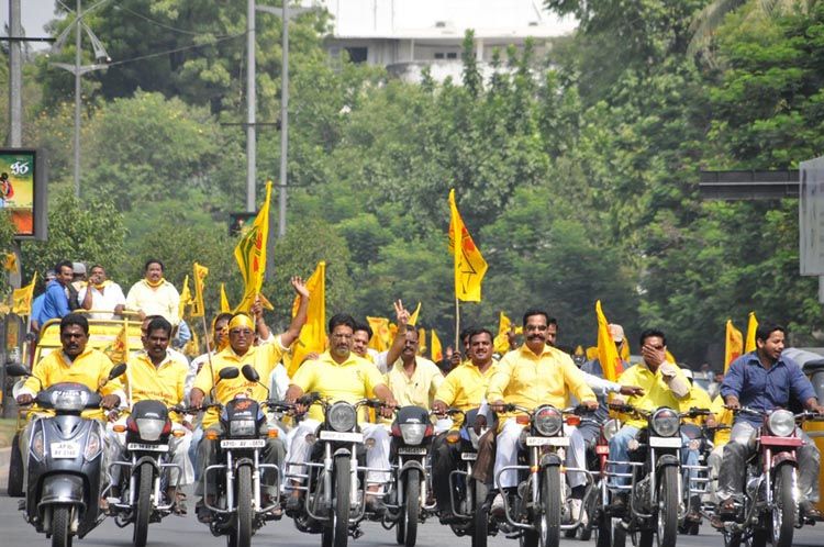 Former Hyderabad city Mayor T Krishna Reddy leading a bike rally to the venue of TDP Mahanadu at Gandipet on Friday.