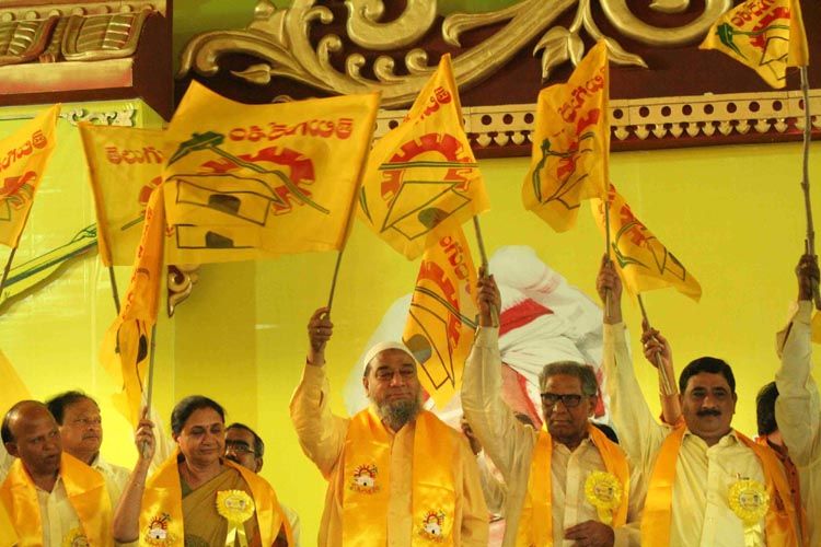 TDP president Chandrababu Naidu with other senior leaders at Mahanadu - a three day conclave of the party which began at Gandipet on Friday.