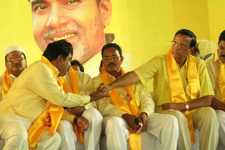 Gali Muddukrishnama Naidu shaking hands with Errabelli Dayakara Rao at TDP Mahanadu.