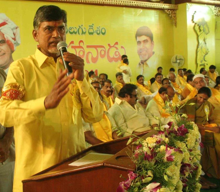 Telugu Desam Party president N Chandrababu Naidu addresses the gathering at the party’s annual conclave ‘Mahanadu’ at Gandipet in Hyderabad on Friday.